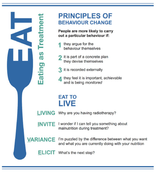 - Britton, B.; Baker, A.; Wolfenden, L.; Wratten, C.; Bauer, J.; Beck, A.K.; McCarter, K.; Harrowfield, J.; Isenring, E.; Tang, C.; et al. Eating As Treatment (EAT): A stepped-wedge, randomised controlled trial of a health behaviour change intervention provided by dietitians to improve nutrition in patients with head and neck cancer undergoing radiotherapy. Int. J. Radiat. Oncol. Biol. Phys. 2019, 103, 353–362. [Google Scholar] [CrossRef]