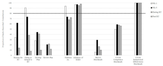 Post-training delivery of the EAT Intervention is presented in Figure 2. Within the week five intervention consultations sampled, of the two “unique” elements of the EAT Intervention “Eating as Integral”, but not “Reasons for Radiotherapy” met the threshold for “high fidelity”, being delivered in 88.2% and 61.7% of the week five sessions sampled, respectively. The development and review of a nutrition plan fell short of “high fidelity” delivery across all sessions sampled. Both “non-unique” elements were delivered with “high fidelity”, with “adequacy of intake” discussed in more than 97% of week five sessions and “nutrition assessment” conducted in more than 93% of week one consultations. All study skills were utilised in consultations conducted outside of week five of radiotherapy (i.e., “as needed”), and with the exception of “reasons for radiotherapy” continued to be integrated into post-radiotherapy consultations.