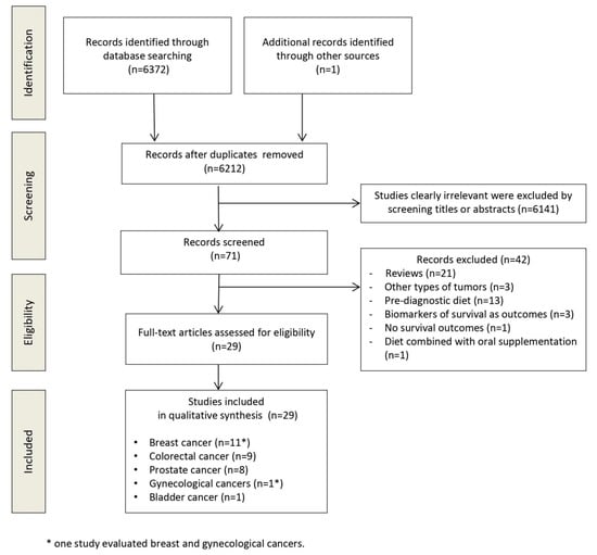 According to the World Health Organization (WHO), the cancer burden rose to 18.1 million new cases and 9.6 million cancer deaths in 2018 [1]. Convincing evidence supports a reduced risk of different types of cancer among healthy populations that follow specific dietary regimens [2,3,4]. Indeed, a recent meta-analysis suggested an association between healthy dietary patterns and decreased risk of colon and breast cancer [2]. Especially, adherence to the Mediterranean diet is associated with a lower incidence of several cancer types such as colorectal cancer [3]. The beneficial effects of Mediterranean diet are mainly driven by higher intakes of fruit, vegetables, and whole grains [4]. In contrast, evidence for the role of post-diagnostic diet in cancer survival remains limited. However, malnutrition, defined as a state resulting from lack of intake of nutrition that leads to altered body composition, is common among cancer patients due to the disease itself and oncologic treatments [5,6]. To prevent malnutrition, energy and protein requirements for cancer patients are largely widespread by international guidelines [7,8,9] but little is known about the food choices and dietary regimen a cancer patient should benefit from. In this context, cancer patients are often motivated to learn how food choices and dietary patterns can improve their nutritional status and response to treatment and reduce risk of cancer recurrence and cancer-specific mortality. Thus, web sources are full of fake prescriptions or confounding statements easily shared by patients without any endorsement by the scientific community [10]. Many “cancer diets” are often restrictive, avoiding a whole nutrient class (i.e., meat or dairy products) in the misleading belief that certain foods “feed the tumor” [10]. In the last decades, a growing number of prospective cohort studies [11,12,13,14,15,16] have investigated the association between post-diagnostic dietary patterns—such as Western diet (WD) and prudent diet (PD)—or food type—such as meat, dairy products, dietary fiber, nuts—and prognostic outcomes among patients with different cancers. This systematic review aims to investigate possible associations between dietary patterns/choices after cancer diagnosis and prognostic outcomes (i.e., mortality, cancer progression, and recurrence) in patients affected by main solid tumors.