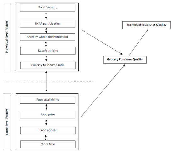 Conceptual framework depicts the proposed relationship between socioeconomic and demographic factors at the individual- and environmental-level that shape the dietary quality of a household’s grocery purchases and subsequent immediate home food environment and individual-level diet quality.