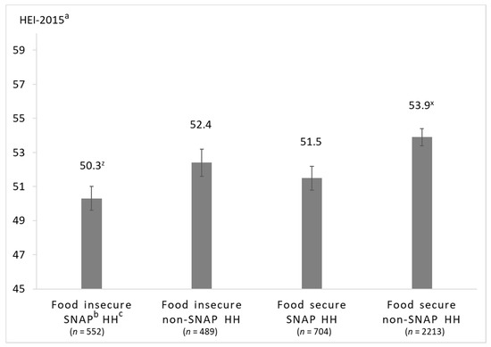 Multivariable-adjusted least square means of total HEI-2015 score of household grocery purchases among households participating in the National Household Food Acquisition and Purchase Survey 2012–2013, (n = 3958), stratified by food security status and SNAP-participation. a Healthy Eating Index 2015; b Supplemental Nutrition Assistance Program; c household. Adjusted for age of the primary respondent, family income-to-poverty ratio, any smoker in the household, and education level of the primary respondent. Between-group differences were determined by post hoc tests using Tukey’s method, testing all pairwise comparisons. Scores with different superscripted letters (e.g., x and z) indicate significant post hoc differences between groups (p < 0.05).