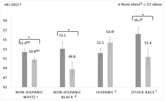 Multivariable-adjusted least square means of total HEI-2015 score of household grocery purchases of households participating in the National Household Food Acquisition and Purchase Survey 2012–2013, (n = 3954), stratified by race/ethnicity and weight status of household members (none obese vs. ≥1 obese). a Healthy Eating Index 2015, b obesity defined as body mass index (BMI) ≥ 30 kg/m2, c non-Hispanic White, none obese, n = 1232; non-Hispanic White, ≥1 obese, n = 1161, d non-Hispanic Black, none obese, n = 164; non-Hispanic Black, ≥1 obese, n = 298, e Hispanic, non-obese, n = 292; Hispanic, ≥1 obese, n = 507, f Other race, none obese, n = 187; Other race, ≥1 obese, n = 113. Scores under asterisked (*) brackets indicate significant within race/ethnicity group post hoc differences; superscripted symbols indicate significant between-groups comparison using NHW as the reference group—i.e., ¶ indicates significantly different from NHW, none obese and § indicates significantly different from NHW, ≥1 obese.