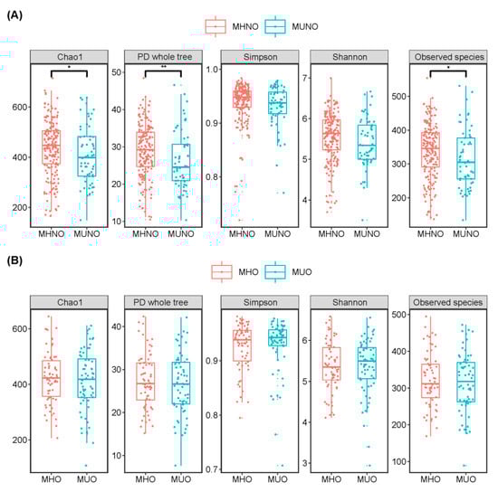 Figure 1. Alpha diversity comparisons between (A) MHNO and MUNO individuals, (B) MHO and MUO individuals. p-values were calculated using Mann-Whitney U tests for unpaired groups. Only the comparisons with false discovery rate-adjusted p values < 0.05 are presented. * p < 0.05, ** p < 0.01.
