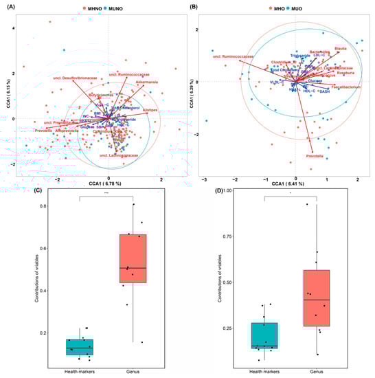 Figure 2. Microbial community variation in the MCR cohort. (A) MHNO vs. MUNO, (B) MHO vs. MUO, (C) the contribution of variables to the variance of MHNO and MUNO bacterial community, (D) the contribution of variables to the variance of MHO and MUO bacterial community. Top contributors of genus to the community variation as determined by redundancy analysis on scaled OTUs abundances (red arrows); metabolic health markers contribute to microbiome community variation (blue arrows). Arrows scaled to contribution. * p < 0.05, *** p < 0.001.