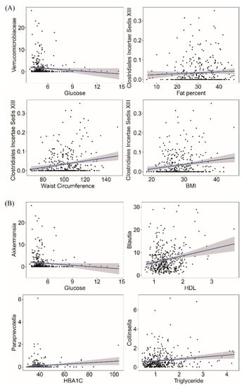 Figure 3. Significant associations between metabolic health markers and taxonomy. Examples of linear regression of metabolic health markers at family level (A) and genus level (B). Permutational multivariate analysis adjusted for age, sex, disease status (CVD and T2DM), medication use (blood pressure, cholesterol lowering and diabetes medication), lifestyle factors (DASH score, smoking status and alcohol consumption).