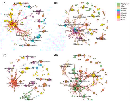 Figure 4. OTU co-occurrence network according to metabolic health phenotype. MHNO (A), MUNO (B), MHO (C) and MUO (D). OTUs (nodes) are colored according to WGCNA module colors. Positive correlations are marked by blue edges correspond and negative correlations are marked by red edges. Edges width and length are scaled to the correlation coefficient. Any resulting correlations with p value 0.05 and abs(r) < 0.6 were removed. Circle size indicates the normalized relative abundance of OTU, and the OTUs with relative abundance > 1% are marked at genus level.