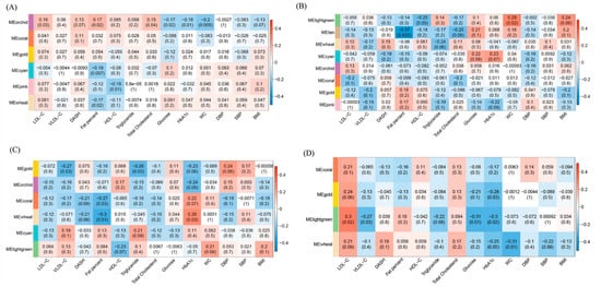 Figure 5. Module–metabolic health markers associations are shown according to metabolic health phenotype. MHNO (A), MUNO (B), MHO (C) and MUO (D). Each cell of the matrix contains the coefficient between one OTU module and a health marker, and the corresponding p value.