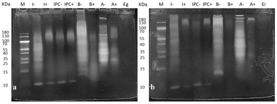 Protein hydrolysis of food after gastric (a) and intestinal (b) digestion. Samples marked with “+” are the digested ones and the samples marked with “−” are the negative controls for each digestion. The protein load was adjusted to 30 μg of protein in each lane, except for the enzyme controls, which were used without dilution. A molecular weight marker (10–180 kDa) was included. I, insect; IPC, insect powder concentrate; B, beef; A, almond; Eg, gastric enzyme control; Ei, intestinal enzyme control; M, molecular weight marker.