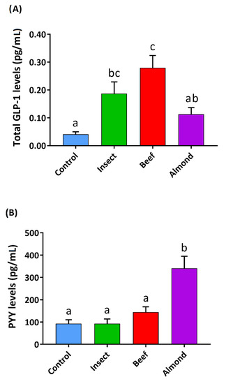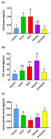 To evaluate the stimulation produced by these digested extracts on enterohormone secretion, we first tested the gastric in vitro digested samples on intestinal duodenum pig segments. Our results (Figure 2) showed that insect and beef digestions stimulated the secretion of CCK more than almond or the control. Additionally, insect and beef showed a similar effect on PYY secretion, but almond was the most effective at increasing PYY secretion. All of the foods tested significantly reduced ghrelin secretion, with beef being the most effective and insect the least. The enzyme control did not affect hormone release, as expected.
