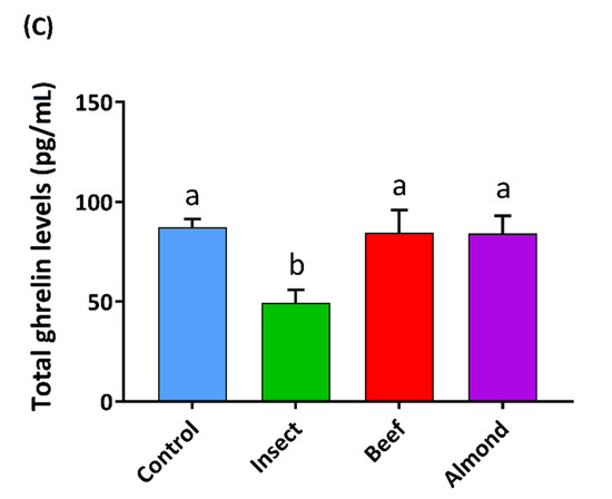 We assayed the duodenal enterohormone response to gastric digestion products working with pig samples. This species is considered a close and valid model for human studies [40], which facilitated the set-up for the procedure. Pig duodenum has been reported to produce high secretions of PYY, together with CCK secretions and measurable amounts of acylated ghrelin [41]. Our results showed that digested insect, almond, and beef significantly modulated the duodenal enterohormone profile, increasing the release of PYY and CCK and reducing that of ghrelin. In addition, the enterohormone secretion profile was different for each one, even though the treatments were performed with the same quantity of protein (15 mg/mL). This suggests that the total amount of protein is not the only factor responsible for the secretion of these satiety hormones. CCK secretion has been reported to be stimulated by lipids and protein [23,42], and PYY is secreted in proportion to caloric intake [42,43]. The reduction of ghrelin levels is proportional to the energy load and macronutrient content, and its suppression is greatly promoted by protein and less effectively by lipids [44,45]. Considering the composition of the digestion (Table S5), the largest component is protein, followed by triglycerides and glucose in a much smaller proportion. The differences in triglycerides also implies that the energy load of each treatment it is different: the insect is the most caloric, followed by almond and beef. Our results show that the increased secretion of PYY and CCK or the inhibition of ghrelin secretion did not correlate with the caloric content or triglycerides of the different food sources, suggesting that the quality of the protein is the primary factor responsible for the observed differences.