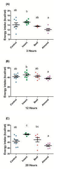 Energy intake after oral administration of a protein dose (300 mg/kg BW). Orally digested samples from insect, beef, or almond were administered to rats. Food intake was measured at three different intervals: 3 h (A), 12 h (B), and 20 h (C) after the beginning of the dark cycle. The control was an equivalent volume of tap water. The sample size was n = 10 rats per group. The results are expressed as the mean ± SEM. One-way ANOVA and Tukey’s post-hoc test were used for multiple comparisons. Different letters (a,b,c) indicate significant differences (p-values < 0.05).The circle, square, and triangle means feeding with different source of proteins.