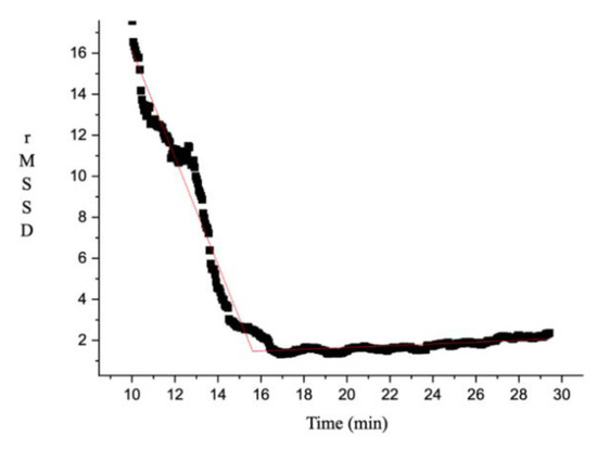 Time domain analysis of RMSSD during the GXT was calculated using a time-varying method with 64-s moving windows and a 3-s shift [30]. A piecewise bilinear fitting function using a proprietary computer program for interactive scientific graphing (OriginPro, Version 2018b, OriginLab Corporation, Northampton, MA, USA) was used to evaluate RMSSD behavior and to determine HRVT during the GXT. Figure 1 exemplifies the pairwise bilinear fitting function. Measures for RMSSD at the beginning of the GXT (y-intercept of the first linear function), RMSSD decline rate (the slope of the first linear function), the time to HRVT and estimated time to vagal withdrawal (x-value at the intersection of the first and second linear functions), and RMSSD value at HRVT and its estimated value at vagal withdrawal (y-value at the intersection of the first and second linear functions) were recorded. R-squared was reported as a measure of goodness-of-fit for the piecewise bilinear fitting function (M ± SD).