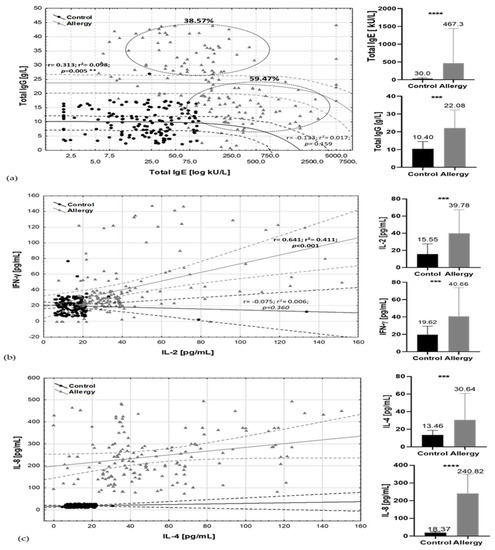 Allergic and inflammatory markers by health status categories. Spread charts include Pearson correlation parameters (r, r2, p) with 95% confidence interval and mean /standard deviation bars of major factors (a) total IgE/total IgG; (b) IL-2/IFN-γ; (c) IL-4/ IL-8. Black dots, lines, bars—control group; grey triangles, lines, bars—allergy group. Solid line, trend line, dashed lines, and circles: 95% confidence range. *** t-test, p-values ≤ 0.001, **** t-test p-values ≤ 0.0001.