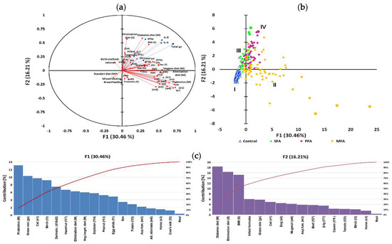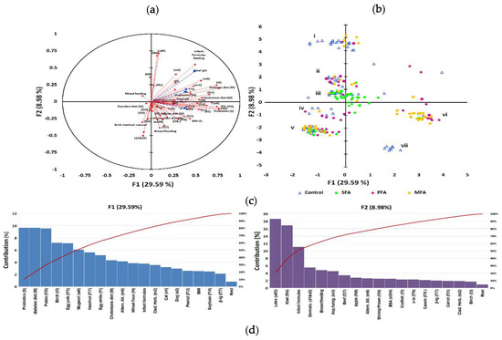 For 29.59% of changes, a newborn probiotic supplementation and gestational diabetic and cholestatic diet of mothers were responsible. In that factor, the dominant contribution of specific IgE profile had antibodies characteristic for SFA and PFA like anti-potato, -egg, -nuts, and -soybean. The high contribution of anti-pollen IgE was also noted in MFA clusters. For 8.98% of variability, meat was associated with a newborn’s formula feeding type and cross-reactions like latex–citrus, dust mites–fish–seafood but also cow’s milk proteins.