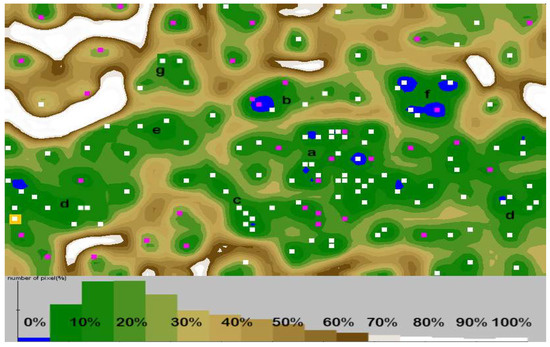 Clusters separated in the form of an artificial neural map (Figure 3d) grouped subjects in 7 clusters. An exact description of clusters is contained in Table S7). There was negative correlation between total IgE and probiotic supplementation of subjects (r = −0.411; p = 0.005). Gestational diabetic and cholestatic diets were more differentiating in the “moderate IgE but high IgG” group of subjects. Subjects with class 4–6 of specific antibodies to eggs and nuts were more often found in groups of children born by mothers that followed gestational cholestatic diets (clusters c and d). Moderate to high (class 2–5) levels of antibodies to apples, carrot, potato, wheat flour, and pollen were determined in groups of children whose mothers were on gestational diabetic diet (clusters a, c and e). High levels (class 5–6) of antibodies to nuts and soybean were more common in children whose mothers follow vegan/vegetarian diets (clusters d and f). Moderate-to-severe reactions to milk (class 2–5) were observed in children of mothers who followed gestational elimination and diabetic diets (clusters a, d and g). Overweight BMI status was associated with cross-reactions and infant formula based infant feeding in cluster b, whereas the normal and underweight BMI status was associated with cross reactions and breastfeeding in cluster e. In the entire analysis the cluster coherence exceeded 80%