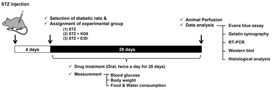 Animal model and drug administration. Male SD injection of S TZ (60 mg/kg Sigma, St. Louis, MO, USA) and control animals received a same volume of saline [40]. Four days after STZ injection, hyperglycemia was confirmed by measuring fasting blood glucose level in a tail vein using an Accu-Chek Compact Plus glucose meter (Roche Diagnostics, Meylan, France). Animals showing blood glucose levels over 250 mg/dL were selected and randomly divided into each experimental group including STZ control, GS-KG9, and GS-E3D. GS-KG9 or GS-E3D (50, 150, or 300 mg/kg) was dissolved in saline and administrated orally twice a day for 4 weeks. STZ control group received equivolumetric oral administration of saline at the corresponding time points. For normal controls, rats received no pharmacological treatment. Body weight and water (mL/day) and food (g/day) consumption were determined every day during the 4-week experimental period. All experimental procedures involving animals complied with the commonly accepted “3Rs” and the ARRIVE guidelines (Animal Research: Reporting of in vivo Experiments). Our experimental protocols were approved by the Institutional Animal Care and Use Committee (IACUC) of Kyung Hee University (permission number: KHUASP(SE)-15-069).