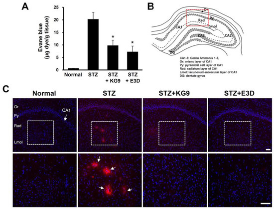 It is known that all forms of diabetes are characterized by chronic hyperglycemia, resulting in the development of a number of microvascular and macrovascular pathologies. Diabetes is also associated with changes in brain microvasculature, leading to dysfunction and ultimately BBB disruption [17,49,50,51]. Since GS-KG9 and GS-E3D caused a significant reduction in blood glucose levels in STZ-induced diabetic rats (in Figure 2), we next investigated whether STZ-induced hyperglycemia would lead to microvascular changes and whether GS-KG9 and GS-E3D inhibit BBB disruption in the brain parenchyma, especially in the hippocampal region. To examine the change in BBB permeability, we injected Evans blue dye into the STZ-treated rats (i.p.) administered for four weeks with GS-KG9 and GS-E3D. As a result, we found leakage of Evans blue dye into the brain parenchyma of STZ-induced diabetic rats, especially into the hippocampal region, but not in normal rats, which means that STZ-induced hyperglycemia resulted in BBB disruption. Furthermore, GS-KG9 or GS-E3D treatment significantly reduced the amount of Evans blue dye extravasation when compared with the STZ control (STZ, 20.3 ± 2.7; STZ+GS-KG9, 9.8 ± 2.1; STZ+GS-E3D, 7.3 ± 2.3 mg/dL) (Figure 3A). Consistent with these results, the fluorescence microscopy images of hippocampal CA1 regions of STZ-induced diabetic rat brains showed the presence of Evans blue dye (bright red) in the brain parenchyma around blood vessels, demonstrating the leakage of the dye across the BBB. However, the intensity of Evans blue was reduced in GS-KG9 or GS-E3D-treated groups (Figure 3B,C). These results indicate that GS-KG9 and GS-E3D inhibit BBB disruption by STZ-induced hyperglycemia.