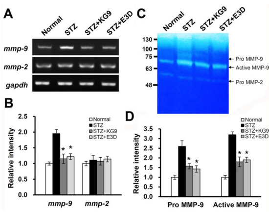 GS-KG9 and GS-E3D inhibit the expression and activity of MMP-9 in the hippocampus of STZ-induced diabetic rats. At 28 d after GS-KG9 and GS-E3D (300 mg/kg) treatment, hippocampal tissue was prepared, as described in the Materials and Methods section. (A) RT-PCR of mmp-2 and mmp-9. (B) Densitometric analysis of RT-PCR (n = 3 rats/group). (C) Gelatin zymography. (D) Densitometric analysis of zymography (n = 3 rats/group). Note that GS-KG9 and GS-E3D significantly inhibit MMP-9 mRNA expression and activation in hyperglycemia-induced rats as compared to STZ control. Data are expressed as the mean ± SD (n = 5 rats/group). * p < 0.05 vs. STZ control.
