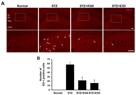 It is known that blood cell infiltration following BBB disruption initiates inflammatory responses, leading to the secondary injury cascade by producing inflammatory mediators. Therefore, we examined the effect of GS-KG9 and GS-E3D on blood cell infiltration by immunofluorescence staining with a macrophage/monocyte cell marker, ED-1 antibody. Immunofluorescence staining showed that ED-1 positive cells were observed in the pyramidal layer and radiatum layer of CA1 at 28 d after drug treatment (Figure 6A, STZ), whereas no ED-1 positive cells were observed in the normal brain (Figure 6A, normal). Furthermore, the number of ED-1 positive cells was significantly decreased in GS-KG9 and GS-E3D-treated groups as compared with the STZ control (STZ, 58 ± 5.8; GS-KG9, 21.8 ± 3.3; GS-E3D, 15.8 ± 3.9) (Figure 6A,B). These results indicate that GS-KG9 and GS-E3D inhibit macrophage infiltration in STZ-induced diabetic rats by preserving BBB integrity.