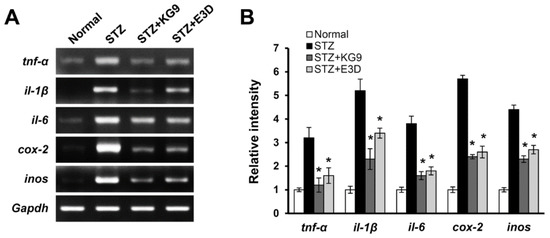 GS-KG9 and GS-E3D inhibit the expression of proinflammatory cytokines and mediators in the hippocampus of STZ-induced diabetic rats. Total RNA from saline, GS-KG9, and GS-E3D (300 mg/kg)-treated hippocampal tissue at 28 d after drug treatment was prepared as described in the Materials and Methods section. (A) RT-PCR of tnf-α, il-1β, il-6, cox-2, and inos. (B) Quantitative analysis of RT-PCR. Data are presented as the mean ± SD. * p < 0.05 vs. STZ control (n = 3 rats/group).