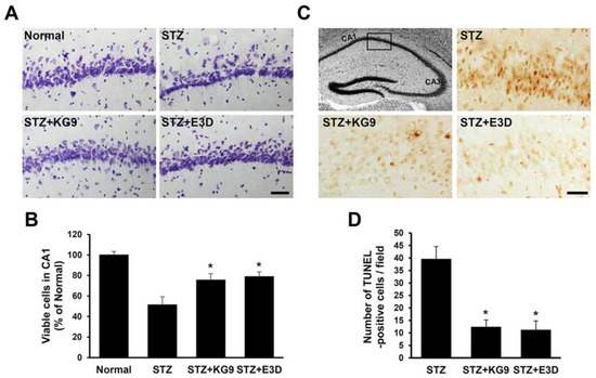There is growing evidence to support the notion that diabetes has adverse effects on the brain, especially on the hippocampus, which is particularly susceptible to neuronal injury and behavior disorder [60,61,62]. Since we showed the inhibitory effect of GS-KG9 and GS-E3D on BBB disruption and neuroinflammation after STZ injection, we postulated that GS-KG9 and GS-E3D would inhibit hippocampal cell damage such as necrosis or apoptosis by STZ-induced hyperglycemia. To examine the cell damage of hippocampal neurons, Nissl staining was performed and hippocampal neurons were counted. As a result, the numbers of pyramidal neurons in hippocampal CA1 region at 32 d after STZ injection were diminished as compared with the normal control group, whereas the loss of hippocampal neurons by STZ injection was attenuated in GS-KG9 and GS-E3D-treated groups (Figure 9A). Quantitative analysis revealed that the number of viable pyramidal neurons in CA1 was decreased to 50% of those of the normal group by STZ, whereas GS-KG9 and GS-E3D treatment significantly attenuated this loss (STZ, 51.4 ± 7.9; GS-KG9, 75.6 ± 6.2; GS-E3D, 78.9 ± 4.7) (Figure 9B). To determine whether the loss of hippocampal neurons in diabetic rats was mediated by apoptotic cell death, TUNEL-staining was performed. As shown in Figure 9C, TUNEL-positive cells were mainly observed in hippocampal CA1 region in STZ-injected rats. However, when compared with the STZ-injected group, TUNEL-positive cells were reduced in GS-KG9 and GS-E3D-treated groups. Quantitative analysis revealed that the number of TUNEL-positive cells in the hippocampal CA1 region was significantly lower in the GS-KG9 and GS-E3D-treated groups than in the STZ-injected control group (STZ, 38 ± 7.9; STZ+GS-KG9, 10.5 ± 3.2; STZ+GS-E3D, 9.8 ± 4.1) (Figure 9C,D). These data imply that GS-KG9 and GS-E3D prevent the loss of hippocampal neurons by apoptotic cell death in STZ-induced diabetic rats.