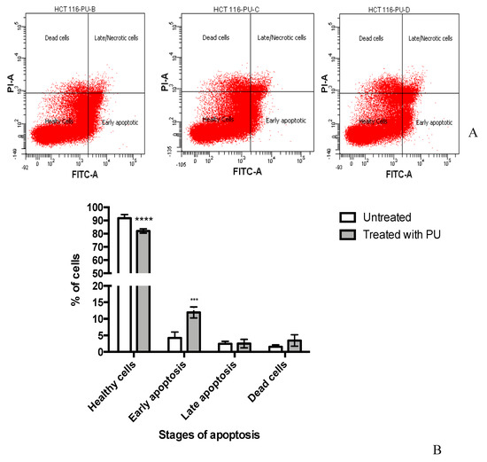 Annexin V assay demonstrated that in PU treated group, on average 11.9% ± 0.949% of cells entered early apoptosis compared to 4.3% ± 1.017% of untreated cells (p < 0.001) (Figure 3). There were no significant differences between treated and untreated group for late apoptosis (2.533% ± 0.731% vs. 2.467% ± 0.410%, respectively) and dead cells phases.