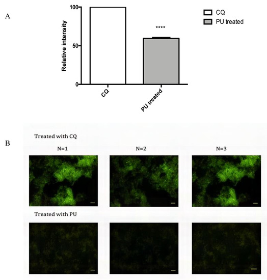 Flow cytometry analysis showed that autophagosome is significantly degraded in PU-treated HCT 116 cells when compared with chloroquine (CQ) treated HCT 116 cells, which explains lesser intensity of staining in the PU treated group. Figure 6A shows fluorescent image of autophagosomes in PU-treated cells and control (CQ treated cells). Chloroquine-treated cells have a higher intensity of staining of autophagosome compared to PU-treated cells, demonstrating the prominent degradation of autophagosomes.