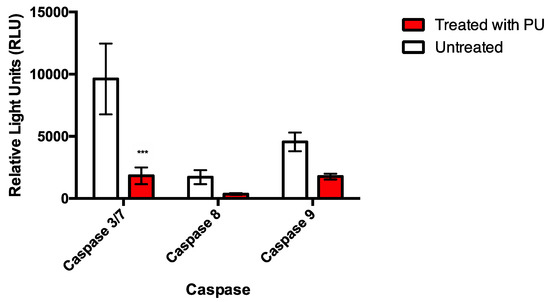 The cells were seeded at a density of 10,000 cells per well in a white-walled 96-well luminometer plate and treated with IC50 value of PU for 72 h. Before starting the assay, Caspase-Glo Reagent was prepared by mixing Caspase Glo substrate with Caspase Glo Buffer provided in the kit. The plate was removed from the incubator and it was allowed to equilibrate to room temperature. Then, 100 µL of Caspase Glo reagent was carefully added to each well and the plate was sealed with a lid. The contents were mixed on a plate shaker 300–500 rpm for 30 s. The contents were incubated for 30 min at room temperature. The luminescence of each sample was measured using a spectrophotometer.