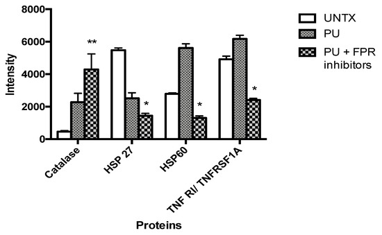 Proteome profiler revealed that catalase, HSP 27 (heat shock protein), HSP 60 and TNFRI/ TNFRSF1A (tumor necrosis factor receptor 1/tumor necrosis factor receptor superfamily member 1A) are the four proteins that were significantly different between untreated and PU + FPR inhibitors-treated HCT 116 cells. Figure 8 shows the expression of the four significantly different proteins in the three different treatment groups. Amongst the 35 tested proteins, three proteins (HSP27, HSP60 and TNFR1/TNRSF1A) were significantly downregulated in the PU + FPR inhibitors-treated HCT 116 cells, while catalase was significantly upregulated as compared to untreated control.