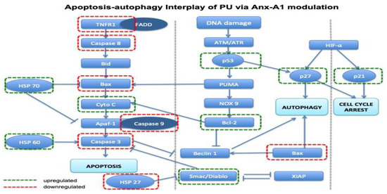 Analysis of the expression of these multiple proteins showed that there’s inclination towards both activation and inhibition of apoptosis and autophagy, therefore suggesting the existence of apoptosis-autophagy switch in PU treatment. A schematic diagram (Figure 9) was illustrated utilizing differently expressed proteins to show possible interplay between apoptosis and autophagy which could possibly explain the mechanism of action of PU in the presence of Anx-A1 inhibition.