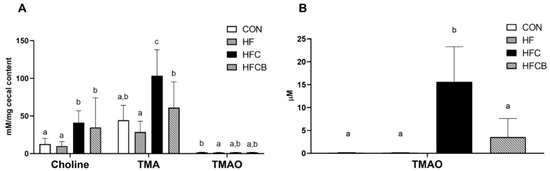 Effect of excessive choline intake on choline-derived metabolites in Sprague-Dawley rats. (A) Choline, trimethylamine (TMA), and trimethylamine-N-oxide (TMAO) in cecal content of the rats. (B) Serum TMAO level in the rats. All data represent the means and standard deviations (n = 8). Within the same metabolite, different small letters above bars indicate significant differences among the groups (p < 0.05; one-way ANOVA and Duncan’s multiple range test). CON (AIN-93G diet), HF (45% high-fat diet), HFC (HF + 1.5% choline water), and HFCB (HFC + 0.6% black raspberry extract).