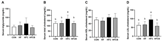 Serum triglycerides (A), total cholesterol (B), high-density lipoprotein (HDL)-cholesterol (C), and low-density lipoprotein (LDL)-cholesterol (D) in Sprague-Dawley rats. All data represent the means and standard deviations (n = 7–8). Different small letters above bars indicate significant differences among the groups (p < 0.05; one-way ANOVA and Duncan’s multiple range test). CON (AIN-93G diet), HF (45% high-fat diet), HFC (HF + 1.5% choline water), and HFCB (HFC + 0.6% black raspberry extract).