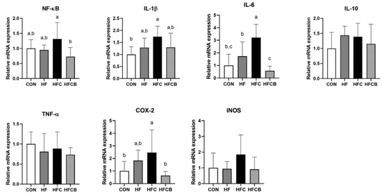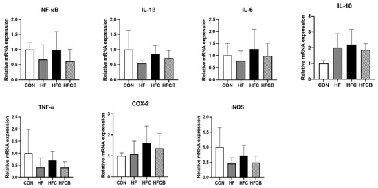 In the adipose tissue, mRNA expressions of IL-6 and COX-2 in the HFC group tended to be higher than in the CON and HF, and those in the HFCB group tended to be lower than those of the HFC (p > 0.05) (Figure 4). The mRNA levels of NF-κB, IL-1β, IL-10, TNF-α, and iNOS did not significantly differ among the groups. It was reported that the mRNA expressions of inflammatory cytokines such as IL-6 and IL-1β in epididymal adipose tissue were upregulated when the mice were fed high-fat diet containing 0.2% TMAO for 12 weeks [6]. Thus, previous studies have reported that inflammatory responses of macrophages in adipose tissue only occurred in prolonged (≥8 weeks) high-fat feeding in the rat [44,45,46]. Accordingly, long-term (≥8 weeks) experiment should be needed to evaluate the effect of excessive choline and BR extract on adipose tissue of rats fed high-fat diet.