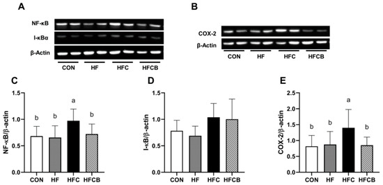 Protein expressions of NF-κB (A,C), I-κB (A,D), and COX-2 (B,E) in the liver of Sprague-Dawley rats. All data represent the means and standard deviations (n = 6–8). Different small letters above bars indicate significant differences among the groups (p < 0.05; one-way ANOVA and Duncan’s multiple range test). CON (AIN-93G diet), HF (45% high-fat diet), HFC (HF + 1.5% choline water), and HFCB (HFC + 0.6% black raspberry extract).