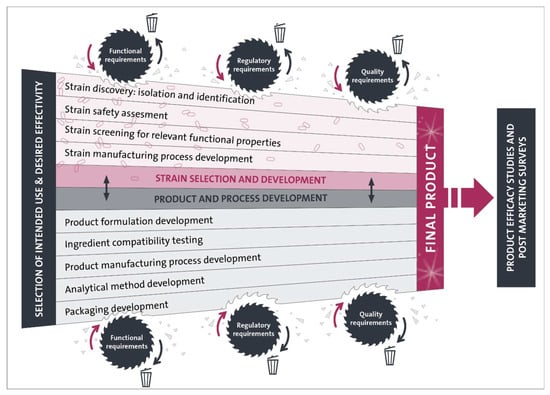 Schematic overview of the multidisciplinary approach that is needed for the development of an evidence-based, indication-specific, multispecies and ready-to-market probiotic. All the steps needed for strain and product development are shaped by the functional, regulatory and quality requirements of the final product. During this process, several candidates (of strains, additives, production process blueprints, and packaging ideas) get discarded. In addition, manufacturing processes are finetuned and analytical methods need to be developed to guarantee consistent efficacy and safety of a finished probiotic product. Strain and product development is followed by product efficacy studies and post-marketing surveys in order to demonstrate clinical efficacy of the finished probiotic product.