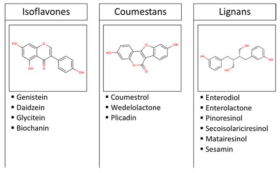 Phytoestrogens are polyphenolic molecules with a structural similarity to endogenous human hormones, hence their estrogenic activity. The main dietary source of these plant secondary metabolites is legumes (particularly soy), and to a lesser extent fruits, vegetables, and cereals []. Figure 1 shows the most common phytoestrogens in diet. According to their origin, lignins are classified into plant lignans (e.g., pinoresinol, secoisolariciresinol, matairesinol, and sesamin) and enterolignans (e.g., enterodiol and enterolactone), which are metabolized from plant lignans by intestinal bacteria []. Although ingested in lower quantities than isoflavones and lignans, prenylflavonoids from beer and coumestans from soy are also regarded as polyphenols with estrogenic activity.