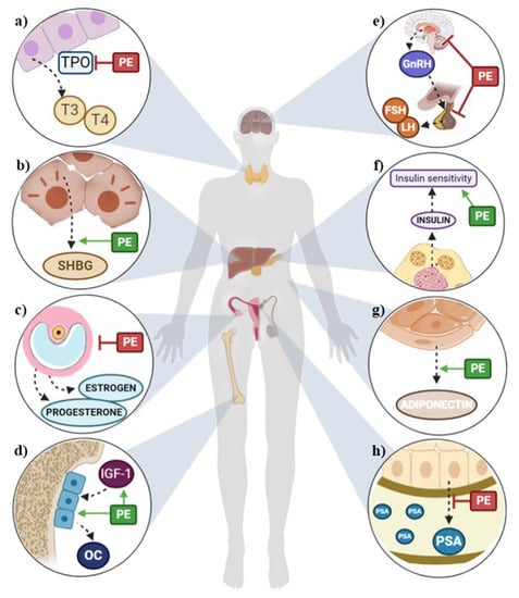 Summary of potential health outcomes of phytoestrogens through the modulation of the endocrine system in (a) thyroids, (b) liver, (c) ovaries, (d) bones, (e) hypothalamic–pituitary–gonadal axis, (f) pancreas, (g) fat tissue, (h) prostate. FSH: follicle-stimulating hormone; GnRH: gonadotropin-releasing hormone; IGF-1: insulin growth factor 1; LH: luteinizing hormone; OC: osteocalcin; PE: phytoestrogens; PSA: prostate-specific antigen; SHBG: stimulating hormone-binding globulin; T3: triiodothyronine; T4: thyroxine; TPO: thyroperoxidase.