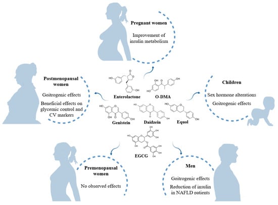 The impact of phytoestrogens can vary according to the life stage (Figure 3). There is particular concern about how they may affect pregnant women, as this has been poorly studied. Soy isoflavones appear not to have any influence on sex and thyroid hormones, bone remodeling and IGF. However, a study focused on cardiometabolic risk reported a decrease in the level of insulin and insulin resistance in pregnant women consuming higher amounts of isoflavones. Although phytoestrogens transfer from maternal blood to the fetus, no effects have been observed in early life. Nor have endocrine changes been found in infants fed with soy formula, except in a retrospective study carried out in the first year of life of infants with congenital hypothyroidism, which reported an increase of TSH but no conclusive effects on thyroid function. Nevertheless, consumption of phytoestrogens in conditions of insufficient iodine and hypothyroidism may negatively affect thyroid function and favor endocrine imbalance, although such effects have not been observed in euthyroid individuals living in areas with enough supply of iodine. In later stages of childhood, an increase of androgens and decrease of estrogens associated with dietary phytoestrogens have been observed in girls and boys, respectively.