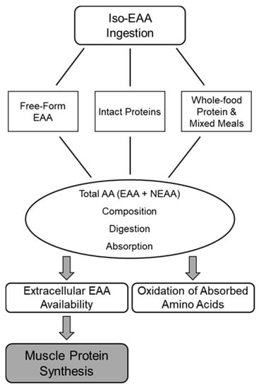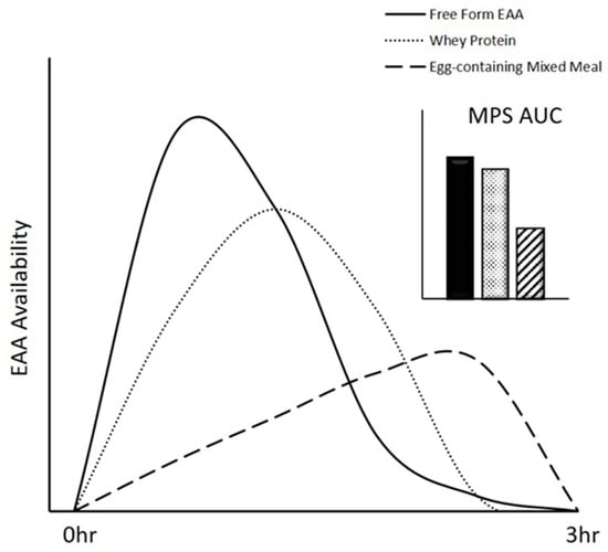 Amino acid feeding formats, which include supplemental free-form amino acid mixtures, supplemental isolated intact proteins (e.g., whey protein), whole-food proteins, and protein-containing mixed meals (Figure 1), differentially stimulate MPS. The varying effects of these formats on MPS are driven by the EAA content, digestion, and absorption kinetics of the particular format. These aspects, in turn, influence postprandial EAA concentrations, which are primarily responsible for stimulating MPS (Figure 2). Orally consumed free-form EAA do not require digestion, so they are absorbed and enter peripheral circulation rapidly, resulting in robust increases in EAA concentrations [48]. In contrast, isolated intact proteins, whole-food proteins, and protein-containing mixed meals must be digested before amino acid absorption. The co-ingestion of other nutrients may also influence their digestion and absorption, resulting in variations in postprandial EAA concentrations. Very few studies have directly compared the effects of supplemental free-form EAA, supplemental isolated intact proteins, whole-food proteins, or protein-containing mixed meals on postprandial EAA concentrations and MPS, though they have been independently studied in great detail.
