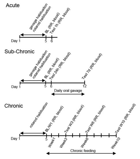 Experimental design for the different exposure schedules (acute, subchronic, and chronic). BL: Baseline measurement; blood: blood draw with glucose and R-βHB measurements; RR: Rotarod test; blood: blood draw with glucose and R-βHB measurements.