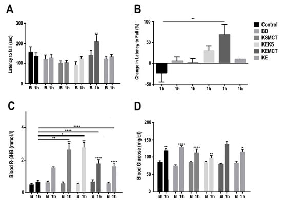 Changes in motor performance and blood parameters from postexercise state for one-year old Sprague-Dawley rats, 1 h following treatment. (A) Latency to fall (sec) on accelerating rotarod at each timepoint. (B) Percent change in latency to fall on accelerating rotarod at 1 h, compared to baseline. (C) Blood R-βHB levels in postexercise state at each timepoint. (D) Blood glucose levels in postexercise state at each timepoint. Abbreviations: B: Baseline; 1 h: 1 h timepoint; R-βHB: R-beta-hydroxybutyrate; BD: butanediol; KE: ketone ester; KEKS: combination of ketone ester and ketone salt (KS); KEMCT: ketone ester in combination with medium chain triglyceride (MCT); KSMCT: ketone-salt in combination with medium chain triglyceride (MCT); SPD: Sprague-Dawley rats. *: p < 0.05, **: p < 0.01, and ****: p < 0.0001 level of significance.