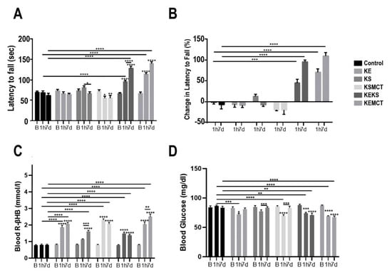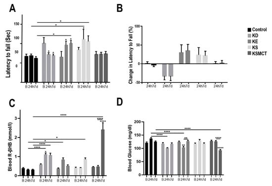 Motor performance and blood parameters in postexercise state for 4-month-old Sprague-Dawley rats after subchronic treatment, measured at baseline, 24 h and at 7 days following treatment. (A) The latency to fall (sec) on the accelerating rotarod was presented at each timepoint. (B) The percent change in latency to fall on the accelerating rotarod presented at 24 h and at 7 days, compared to baseline. (C) Blood R-βHB levels are presented in postexercise state at each timepoint. (D) Blood glucose levels are presented in postexercise state at each timepoint. Abbreviations: B: Baseline; 24 h: 24 h timepoint; 7d: 7 days timepoint; R-βHB: R-beta-hydroxybutyrate; KD: ketogenic diet; KE: ketone ester; KS: ketone salt; KSMCT: ketone salt in combination with medium chain triglyceride (MCT); SPD: Sprague-Dawley rats. *: p < 0.05, **: p < 0.01, and ****: p < 0.0001 level of significance.