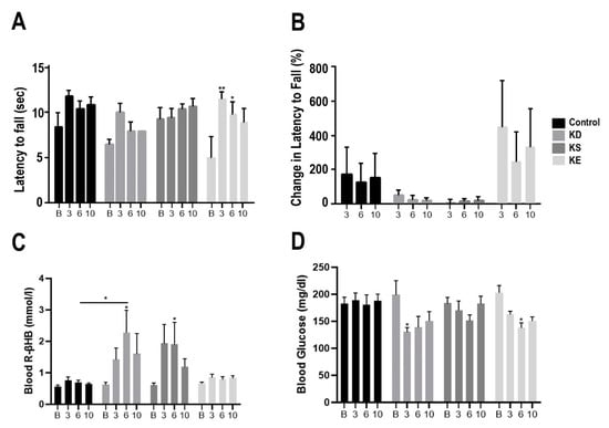 Changes in motor performance and blood parameters in postexercise state for G1D mice with chronic treatment, at baseline, at week 3, at weeks 6, and at week 10. (A) The latency to fall (sec) on accelerating rotarod presented, compared to baseline. (B) The percent change in latency to fall at each timepoint, compared to baseline. (C) Blood R-βHB levels are presented in postexercise state at each timepoint. (D) Blood glucose levels are presented in postexercise state at each timepoint. Abbreviations: B: Baseline; 3: Week 3; 6: Week 6; 10: Week 10; R-βHB, R-beta-hydroxybutyrate; G1D, Glucose Transporter Type-1 Deficiency Syndrome mice; KD, ketogenic diet; KE, ketone ester; KS, ketone-salt. *: p < 0.05, **: p < 0.01 level of significance.