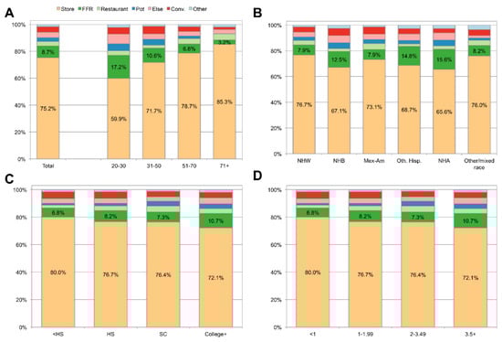 For each food/beverage in the 24-h recall, NHANES respondents also reported the source location. Those were assigned in the database into 26 categories including store, fast food restaurant, full-service restaurant, convenience store, common coffee pot, from someone else/gift, and mail order, among others.