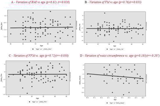 The differences for all subjects after 2 months are shown in Table 3. Analysis of the results of the entire sample, two months after the start of nutritional therapy, shows a significant difference in BMI of −0.8 ± 0.5 kg/m2, FM of −2.3 ± 2.1 kg and FFM of −0.7 ± 1.6 kg, of which TBW was −0.6 ± 1.1 kg and body protein was −0.1 ± 0.7 kg (p = 0.190). No significant correlation is observed between patients’ age and BC variation during treatment (Figure 1). The change in lifestyle also brought a significant improvement in body circumference and blood pressure. The variation in basal metabolic rate (BMR) was −25.6 ± 38.3 kcal/day. The weight loss allowed a significant improvement of some lipid blood values, such as total cholesterol and LDL, in the whole sample.