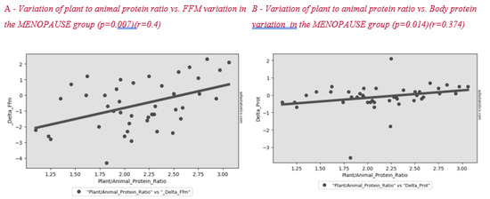 Figure 2 shows the correlation between plant to animal protein ratio and FFM variation after lifestyle intervention. A positive significant correlation between these parameters was found in all subjects and in the menopause group (Figure 3).