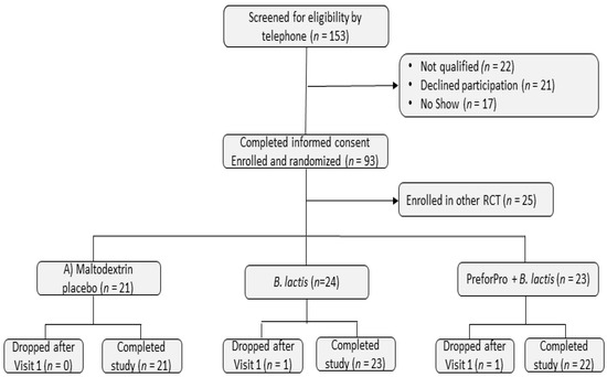 After undergoing sample collections and analysis procedures at the baseline visit, participants were randomly assigned to 1 of 3 treatments groups: (A) 15 mg rice maltodextrin (placebo); (B) 1 × 109 Colony Forming Units (CFU) Bifidobacterium animalis subspecies lactis strain BL04 (B. lactis BL04); or (C) 1 × 109 CFU B. lactis BL04 + 1 × 106 Plaque Forming Units (PFU) LH01-Myoviridae, LL5-Siphoviridae, T4D-Myoviridae, and LL12-Myoviridae bacteriophages, marketed as PreforPro (B. lactis BL04 + PreforPro). Participants were asked to consume one 15-mg capsule per day during the 4-week intervention period. All treatment capsules contained maltodextrin from rice and medium chain triglycerides from palm and coconut oil as a filler material. Participants were randomized to treatment groups using the second generator at www.randomization.com. To assess treatment compliance, participants returned all unused treatment capsules at their final visit.