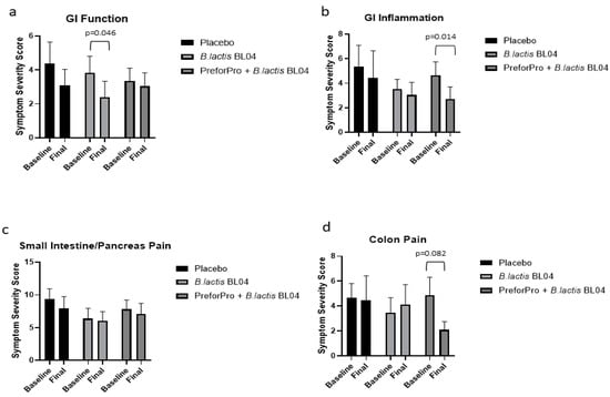 Total point scores for each section of the digestive health questionnaire represent symptom severity related to gastric function, GI inflammation, small intestine and pancreas pain, and colon pain. Changes in individual scores, for each section, pre- to post-treatment are shown in Supplemental Figure S1. There was a significant main effect for Time (p = 0.004) and average scores from the gastric function section of the questionnaire were significantly reduced (improved) with B. lactis BL04 treatment (Figure 2a; p = 0.046; [CI: −2.851 to −0.019]); although there were no significant changes in gastric function noted within the placebo or the PreforPro + B. lactis BL04 group or among any of the treatments. There was also a significant main effect for time (p = 0.005) in perceived improvement in GI inflammation and a significant reduction in the average symptom severity with the B. lactis BL04 + PreforPro treatment (Figure 2b; p = 0.005; [CI: −3.509 to −0.307]). While there were no other statistically significant differences observed, there was also a trend for improved colon pain in individuals on the B. lactis BL04 + PreforPro treatment (Figure 2d; p = 0.082; [CI: −5.802 to 0.2568]). Notably, while there were no other significant improvements, there were also no significant worsening of symptoms, indicating that both treatments, at the levels administered, were tolerable.