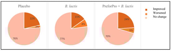The GI health questionnaire scores corresponded to priority levels of mild (0–24 total points), moderate (25–48 total points), or severe (49–280 total points) symptoms in each of the target areas. Using these priority scores, we were able to calculate whether participants’ symptoms qualitatively worsened, improved, or stayed the same during the study (Figure 3). Regardless of the treatment group, most participants experienced no change in the overall priority level of their perceived GI distress. Only a small percentage of participants experienced an overall worsening of priority status from baseline to follow-up, with the lowest percentage of participants in the placebo group (2%) and the highest percentage in the B. lactis group (8%) moving from a lower to a higher priority score. The PreforPro + B. lactis group saw the greatest percentage (24%) of participants with overall improvements in the priority status of their symptoms (i.e., moved from a higher to a lower priority ranking). In comparison, only 15% of participants on B. lactis alone moved to a lower priority score after treatment.