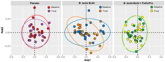 Principle Coordinates Analysis (PCoA) of Bray–Curtis distances at baseline and final visit for each treatment group.